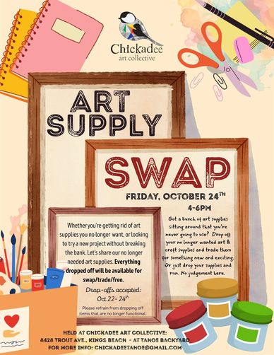Everything dropped off will be available for swap/trade/free. Drop-offs accepted Oct. 22-24th at Chickadee Art Collective. *Please refrain from dropping off items that are no longer functional.